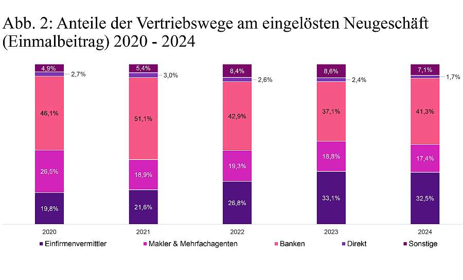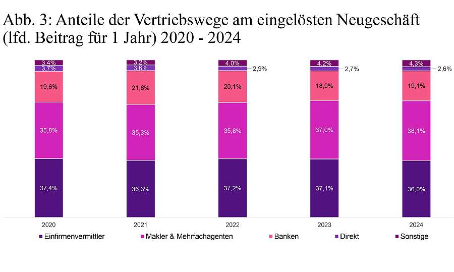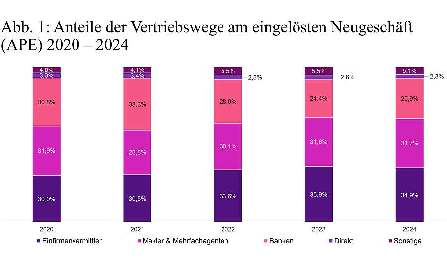 Die Kategorie „Sonstige“ verblieb mit 5,1 Prozent nur knapp unter dem Höchststand aus 2023. Der Direktvertrieb dagegen rutschte zum dritten Mal in Folge ab – auf einen neuen Tiefststand von nur noch 2,3 Prozent.