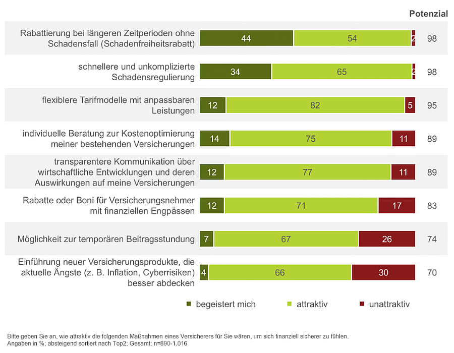 Entsprechend der Erkenntnisse fragte Heute und Morgen auch, welche Maßnahmen eines Versicherers von den Verbrauchern als besonders attraktiv wahrgenommen werden, um sich finanziell sicherer zu fühlen. Die Teilnehmer konnten jeweils mit „begeistert mich“, „attraktiv“ oder „unattraktiv“ antworten.